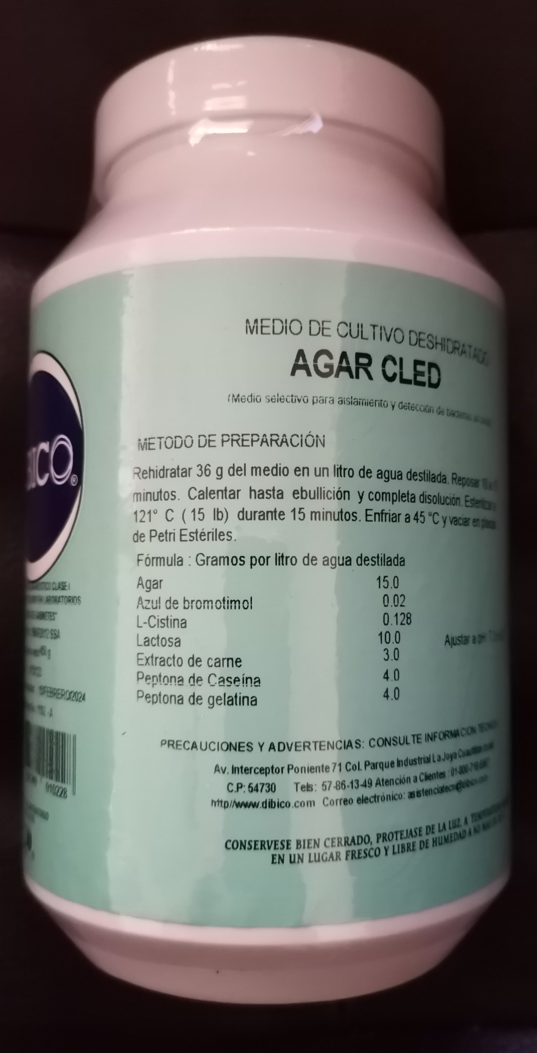 Agar CLED. Medio de cultivo deshidratado selectivo para aislamiento y detección de bacterias en orina, 450g, Marca: Dibico