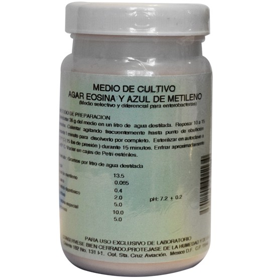 Agar Eosina Azul de Metileno (EMB). Medio de cultivo deshidratado para la identificación y aislamiento de bacilos entéricos Gram Negativos, frasco con 100g, Marca: Dibico