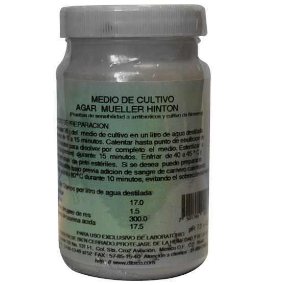 Agar Mueller Hinton. Medio de cultivo deshidratado para pruebas de sensibilidad a antibióticos y cultivo de Neisseria, 450g, Marca Dibico