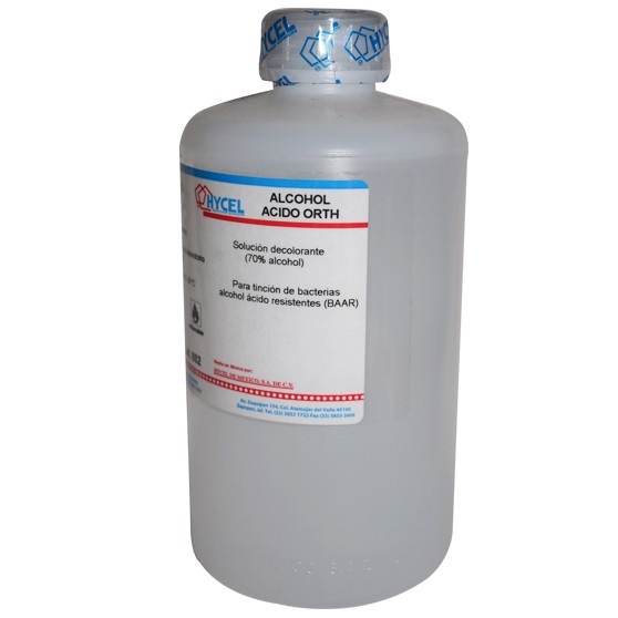 Alcohol-ácido, Orth, 1L. Solución decolorante (70% alcohol). Para tinción de bacterias alcohol ácido resistentes (BAAR). Marca: HYCEL. La tinción de Ziehl-Neelsen (BAAR) es una técnica de tinción diferencial rápida y económica, para la identificación de microorganismos patógenos, como Mycobacterium tuberculosis. La tinción de Ziehl-Neelsen utiliza tres reactivos. El colorante primario es la fucsina que tiñe toda la preparación de rojo brillante. Como mordiente se utiliza flameado de la preparación con el colorante. La solución decolorante alcohol-ácido elimina el colorante primario excepto el los bacilos ácido alcohol resistentes. (BAAR). Por último el azul de metileno tiñe de azul el resto de la preparación.