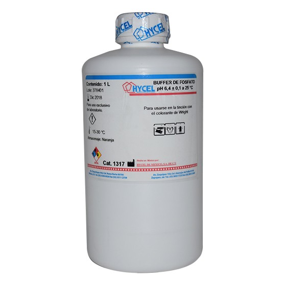 Solución de Buffer de Fosfato pH 6,4 a 25°C, 1L.Para usarse en la tinción con el colorante de Wright. Marca: Hycel. La tinción de wright cuyo colorante está compuesto de azul de metileno (que tiñe de color azul las partes acidas de las células) y eosina (que tiñe las partes alcalinas) disueltos en metanol (que permite la fijación de las células), adicionando a la preparación buffer de fosfatos (que rehidrata a las células después de la exposición con metanol) - Opiniones