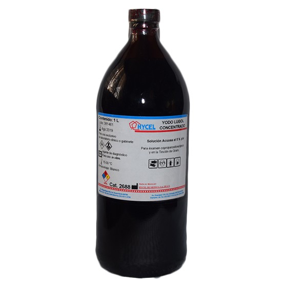 Yodo Lugol Concentrado, Solución acuosa al 5%p/v, 1L, Para exámen coproparasistoscópico y tinción de Gram Marca: Hycel