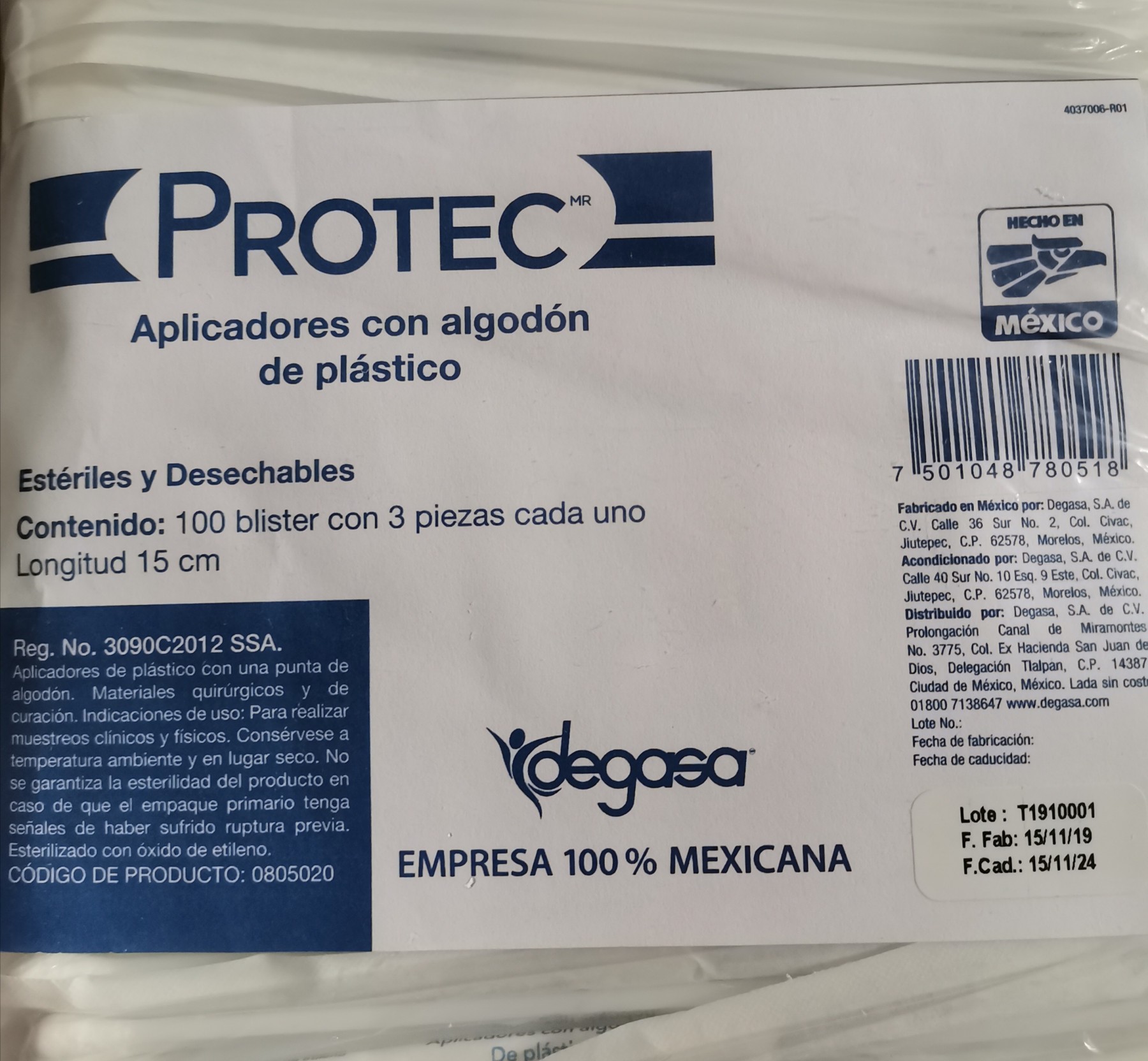 Aplicador de plástico con punta de algodón. Longitud 15cm. Estéril y desechable. 100 bolsas con 3 piezas cada una. Marca Protec